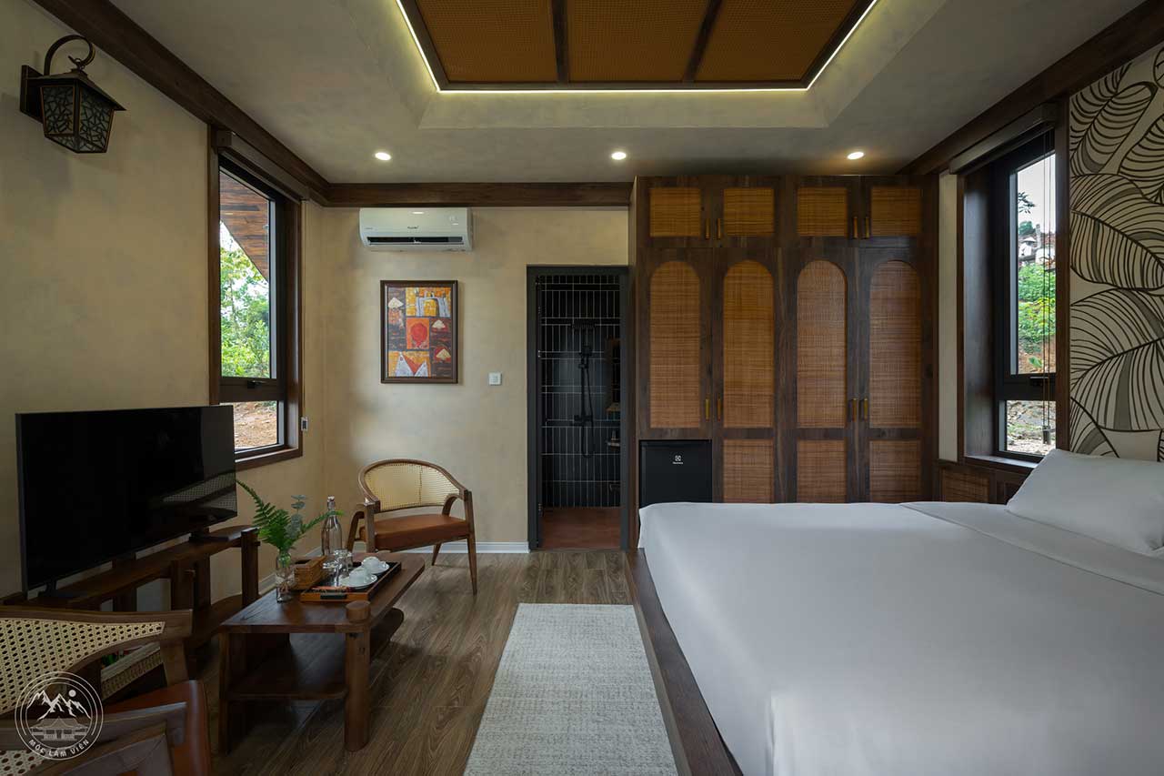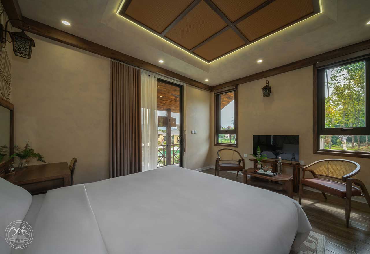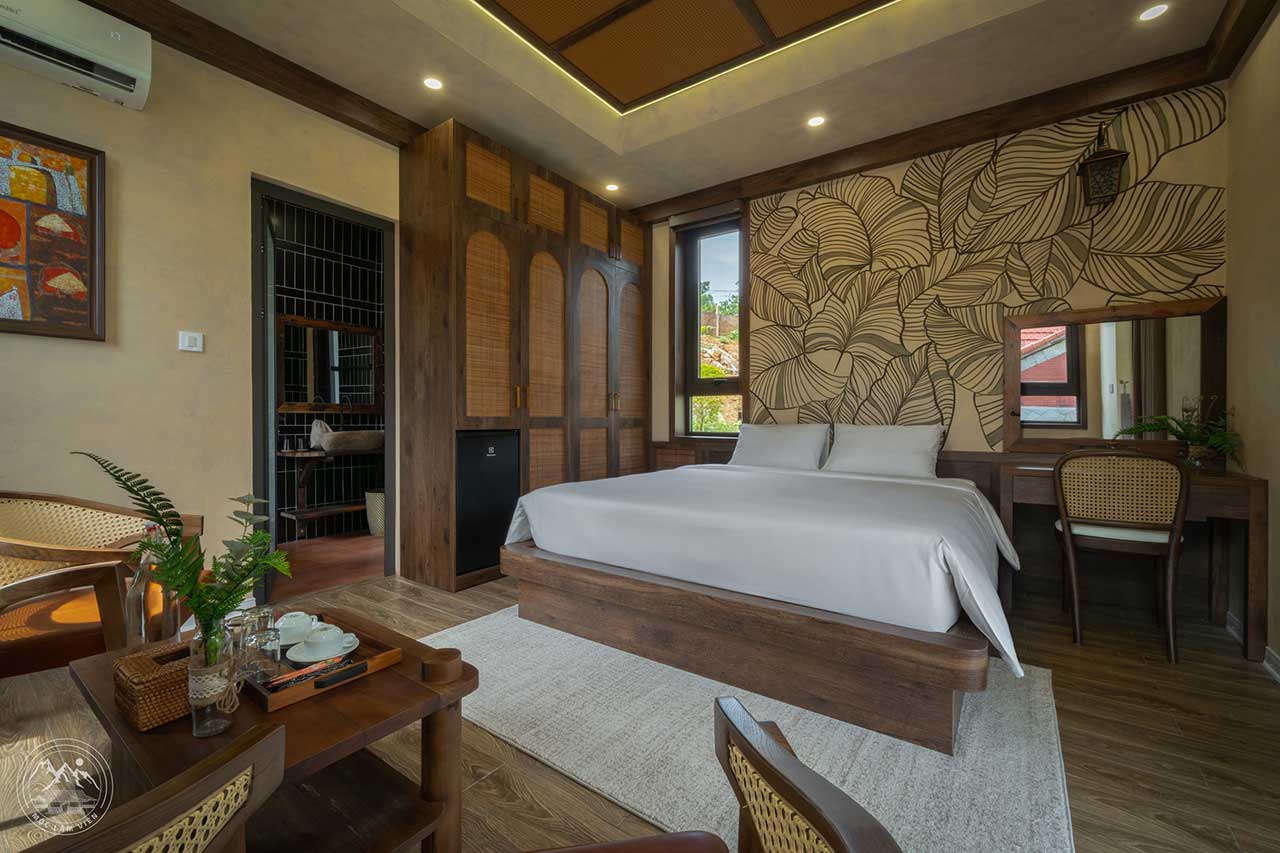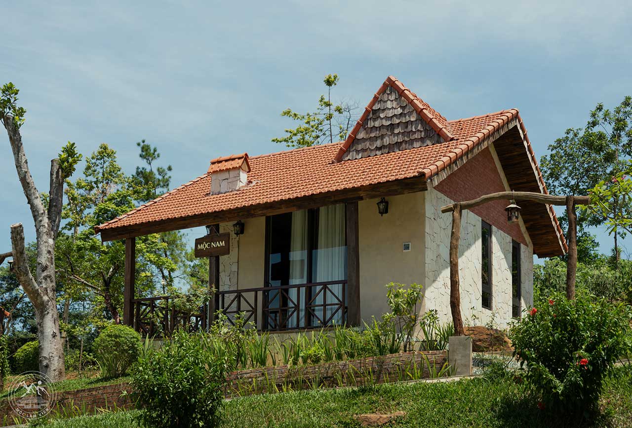 Nằm ở triền đồi của khu nghỉ dưỡng, Mộc Nam Villa mang thiết kế vintage với màu nâu gỗ ấm áp kết hợp cùng gam màu be hiện đại, tạo nên sự hài hòa giữa sang trọng và gần gũi. Nội thất sử dụng chất liệu gỗ tự nhiên mang đến cảm giác thân thiện, đậm chất nghỉ dưỡng xanh.
