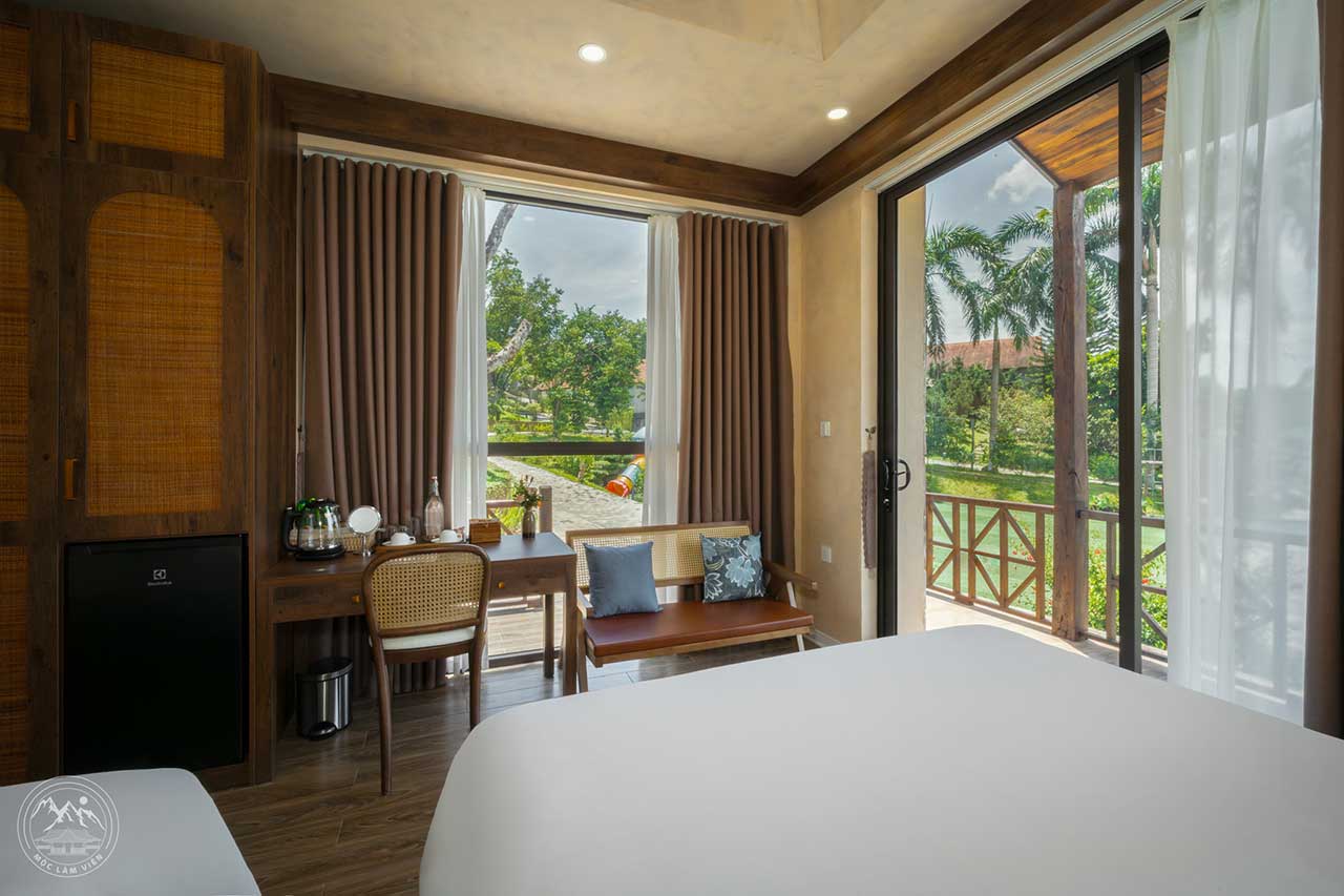 Thư thái tận hưởng giường đôi dành cho 02 người lớn khi ánh sáng ban ngày chiếu rọi qua khung cửa sổ gỗ được lấy cảm hứng từ kiến trúc Pháp, sàn gỗ, những bức tranh nghệ thuật xưa cổ treo tường, cùng với các vật phẩm sưu tầm - tất cả sẽ làm tăng thêm tính chân thực cho trải nghiệm cùng từng vị khách nghỉ dưỡng tại đây.