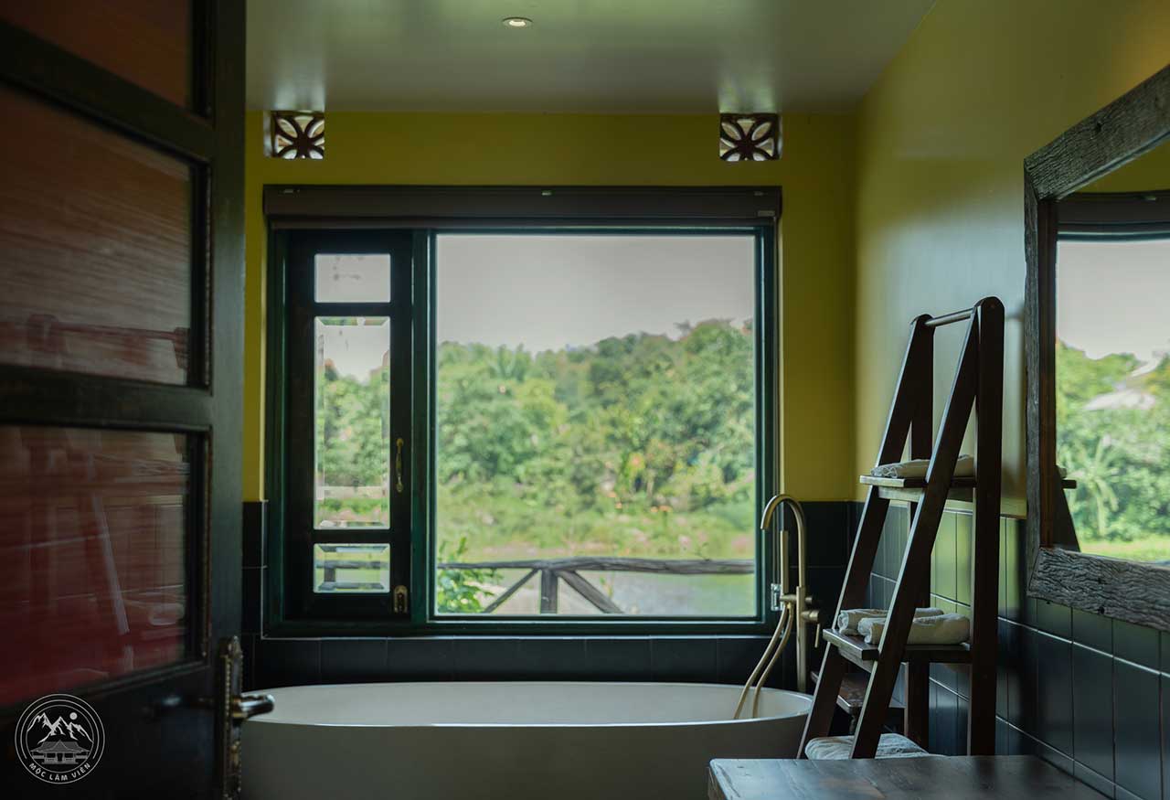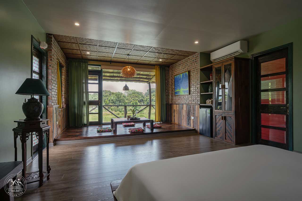 Điểm nhấn là những bức tường gạch thô, trần tre nứa, cùng khung cửa gỗ rộng mở nhìn thẳng ra rừng xanh, hồ nước tạo cảm giác cả căn phòng như đang đồng điệu từng nhịp thời với thiên nhiên.