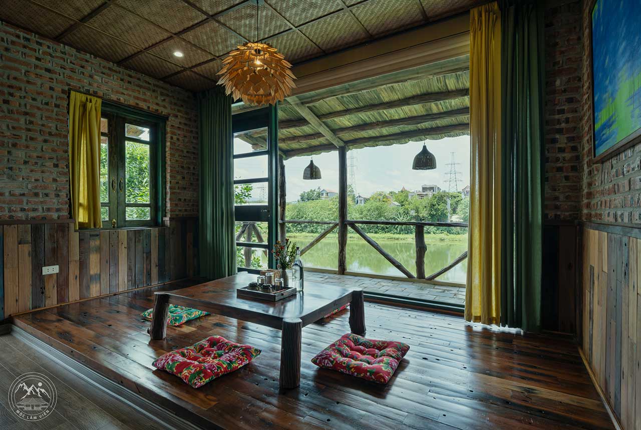 Điểm nhấn là những bức tường gạch thô, trần tre nứa, cùng khung cửa gỗ rộng mở nhìn thẳng ra rừng xanh, hồ nước tạo cảm giác cả căn phòng như đang đồng điệu từng nhịp thời với thiên nhiên.